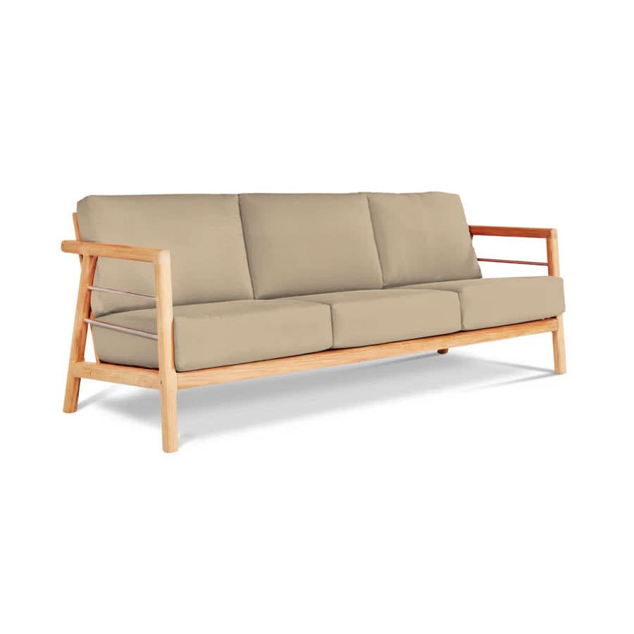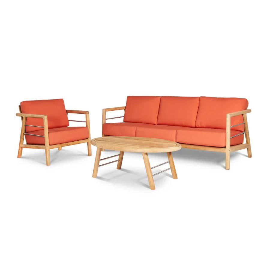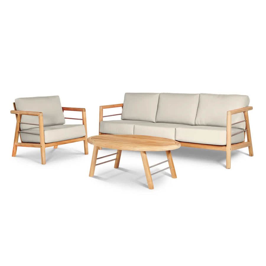 • The Aalto Club Chair is a comfortable outdoor sofa set featuring a sofa, two club chairs and a coffee table made from premium teak and performance fabric.
