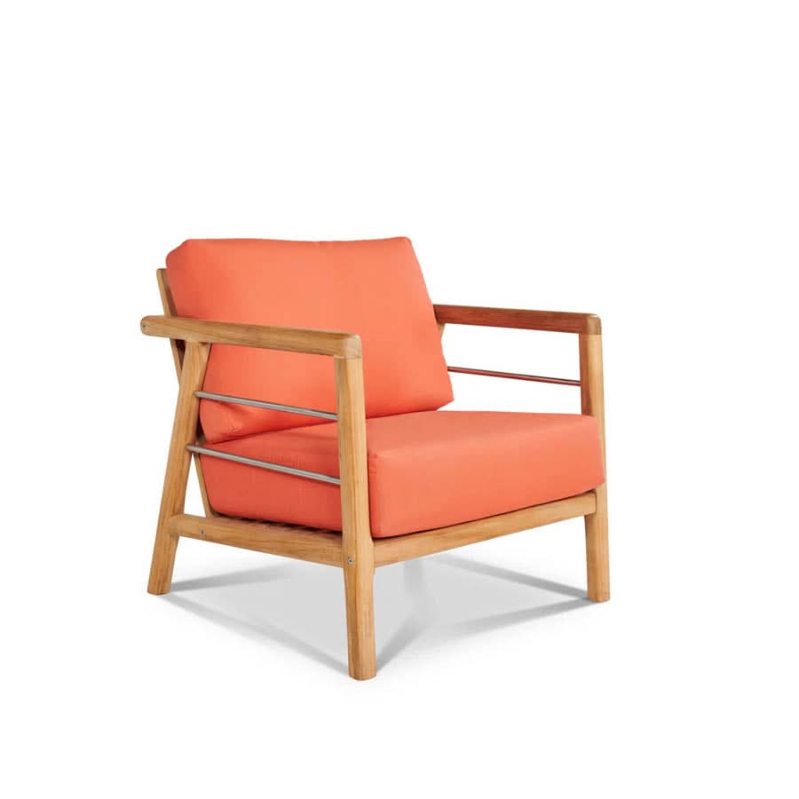The Aalto Club Chair is a comfortable outdoor sofa set featuring a sofa, two club chairs and a coffee table made from premium teak and performance fabric. The Aalto 4-Piece Teak Deep Seating Outdoor Sofa Set with Sunbrella™ Cushions is our nod to mid-century design with a canted back leg and softly rounded frame of premium teak with marine grade stainless steel accents. The set includes one outdoor Aalto sofa, two Aalto Deep Seating Club Chairs and one Aalto Teak Outdoor Table.