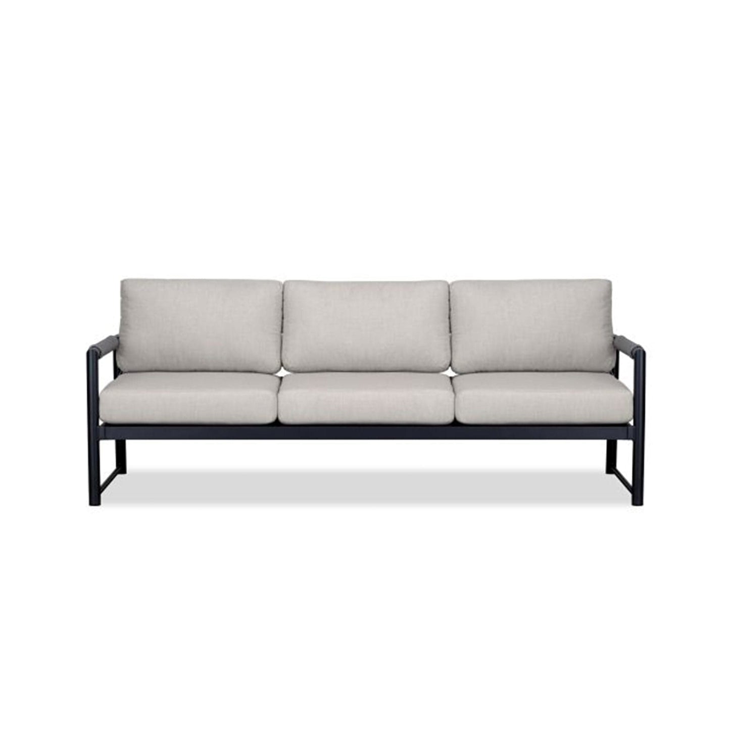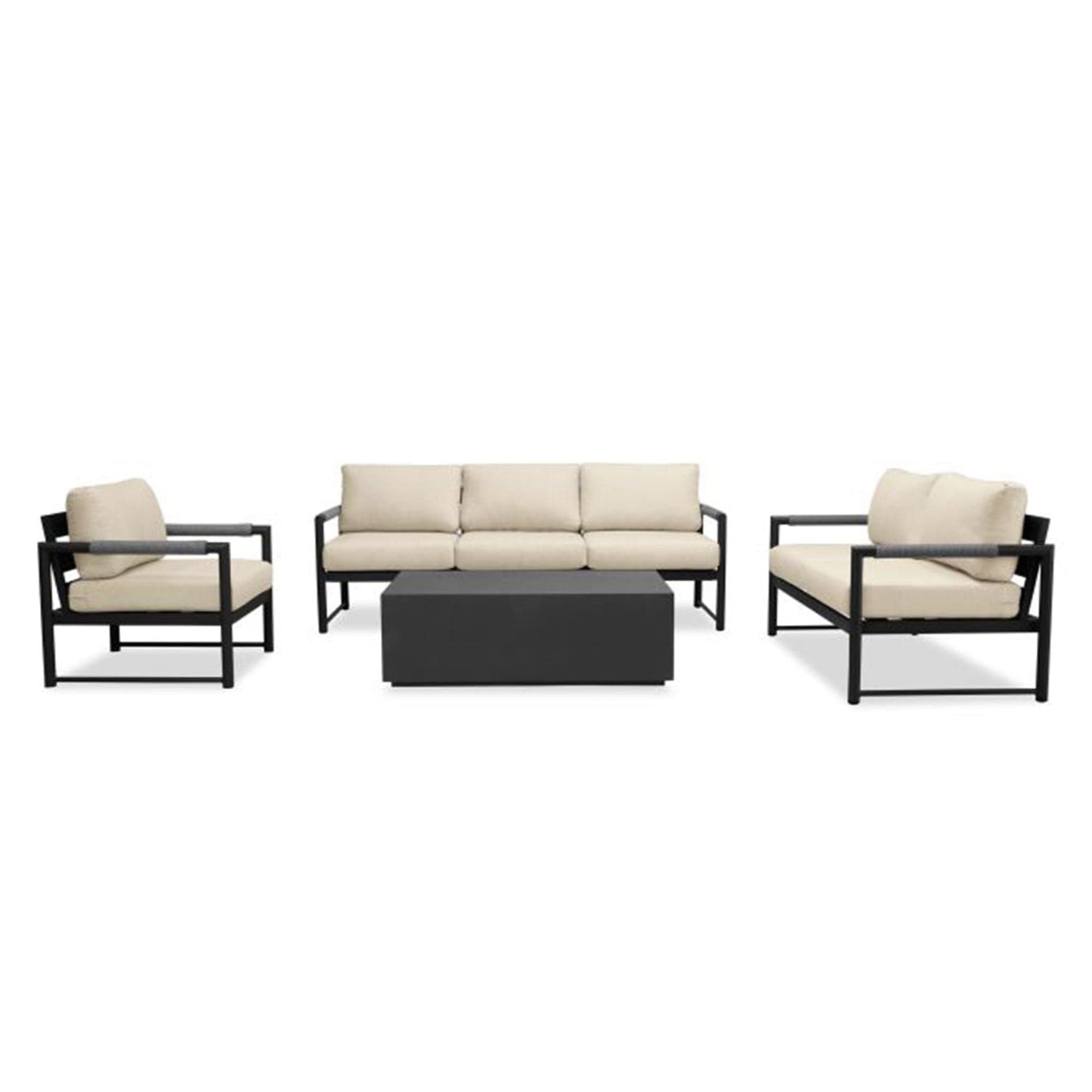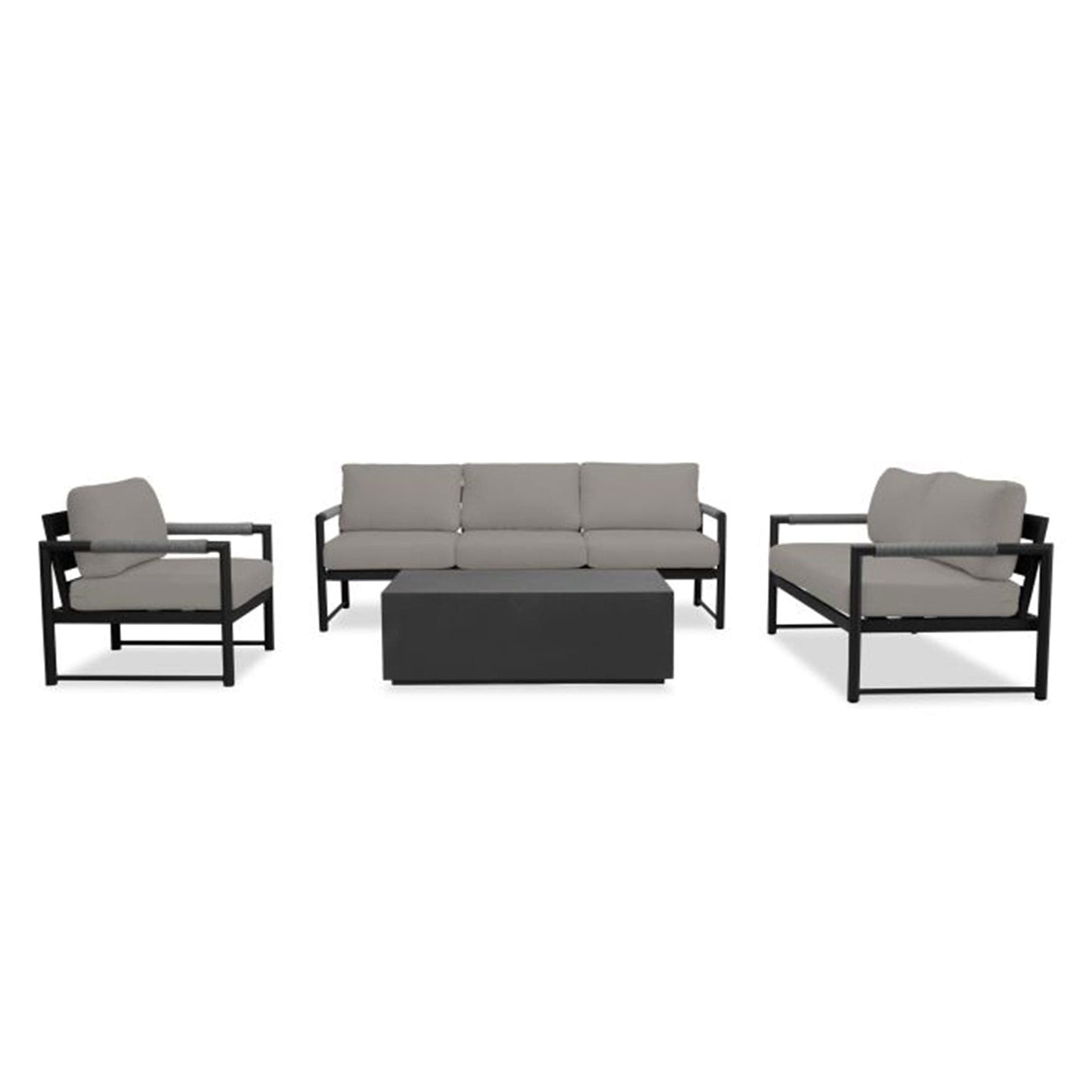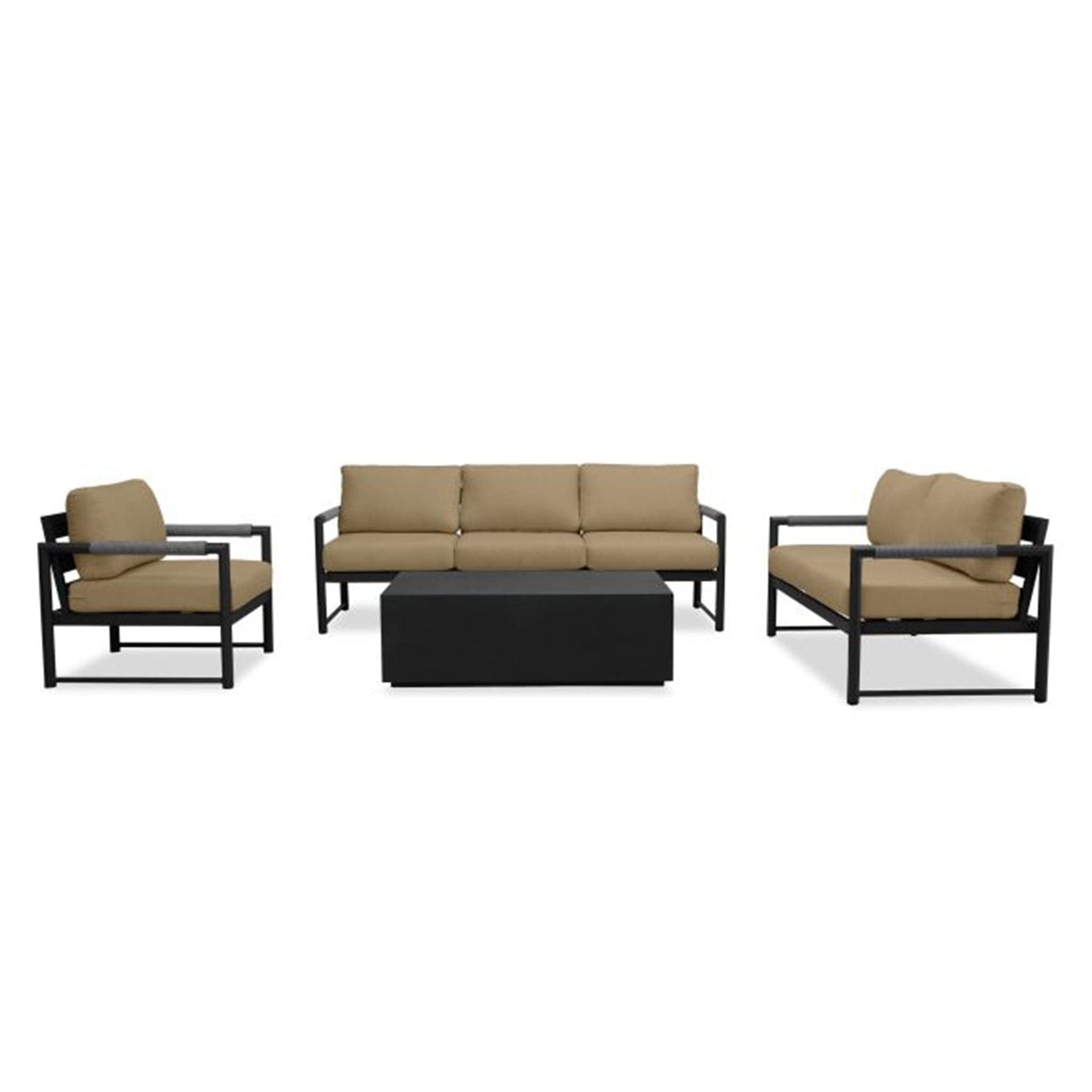 The Alto 4 Piece Sofa Loveseat Set features a Sofa, Loveseat, Club Chair and Coffee Table. Mixed materials, stunning proportions and modern lines are the hallmark of the Alto collection by Harmonia Living. The powder coated, thick gauge, and rust proof aluminum frames are complemented with braided Olefin rope armrests that are both visually appealing and functional. The wrapped armrests give padding as well as heat moderation to improve comfort during hot or cold days. Alto's scale and ergonomics were deliberately chosen to provide deep seating comfort that anyone can appreciate. The modern Alto collection is complete with plush, zippered outdoor cushions made in America from Sunbrella, Revolution and Outdura fabrics to withstand the outdoors year after year in both Residential and Commercial settings