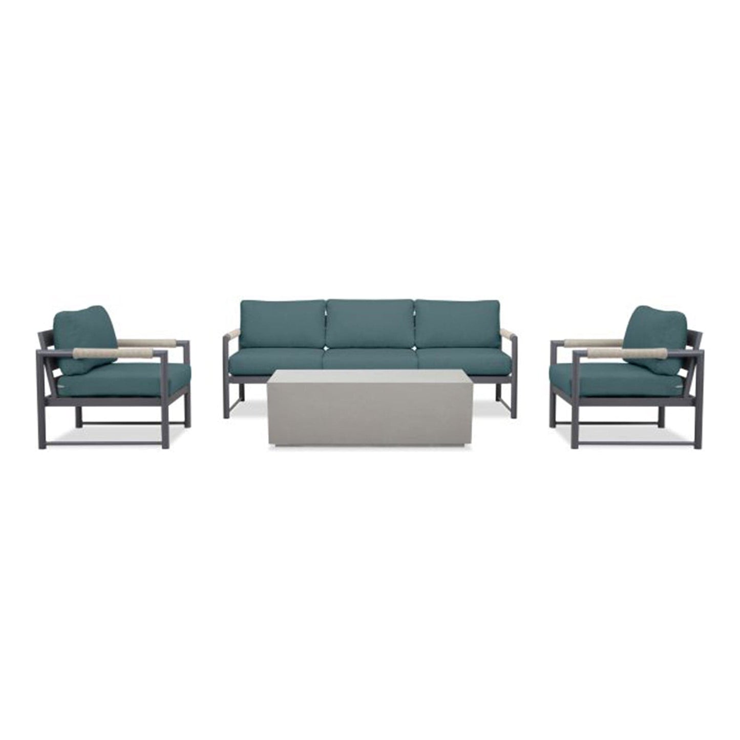 The Alto 4 Piece Sofa Set features a Sofa, two Club Chairs and Coffee Table. Mixed materials, stunning proportions and modern lines are the hallmark of the Alto collection by Harmonia Living. The powder coated, thick gauge, and rust proof aluminum frames are complemented with braided Olefin rope armrests that are both visually appealing and functional. The wrapped armrests give padding as well as heat moderation to improve comfort during hot or cold days. Alto's scale and ergonomics were deliberately chosen to provide deep seating comfort that anyone can appreciate. The modern Alto collection is complete with plush, zippered outdoor cushions made in America from Sunbrella, Revolution and Outdura fabrics to withstand the outdoors year after year in both Residential and Commercial settings