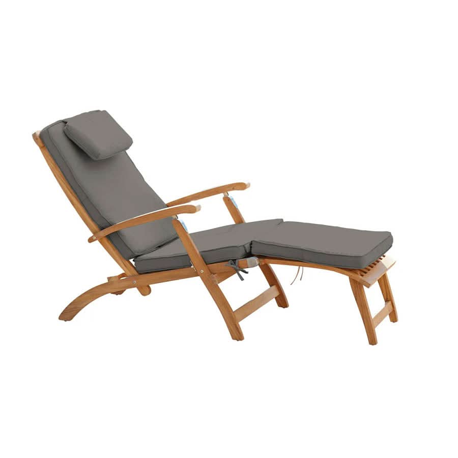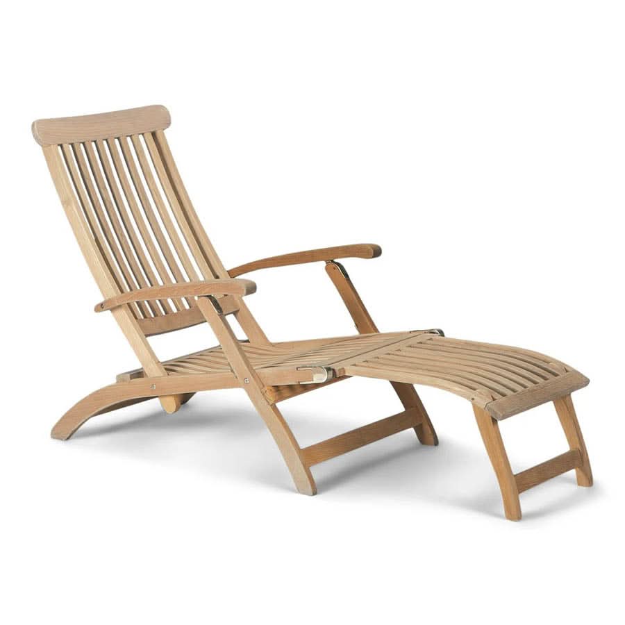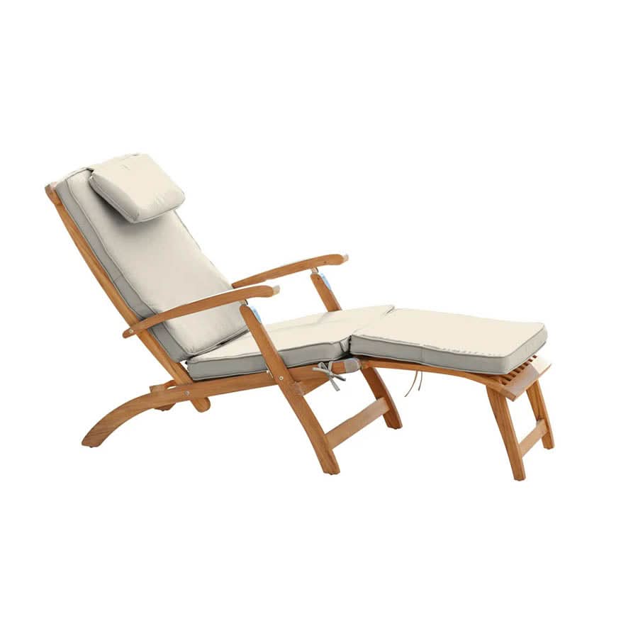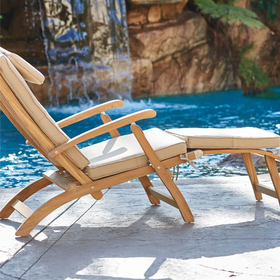 The Anders Deck Chair is a steamer-style chaise lounger made from weather resistant teak and cushioned with performance fabric. There is a reason the Anders Deck Chair was used on the deck of the world's finest steamships. It is perfect for narrow balconies, at the beach, or around the pool and will become a family favorite. This lounge chair features a premium teak frame, stainless steel hardware, and a four-position reclining back ideal for relaxing during hot summer days.