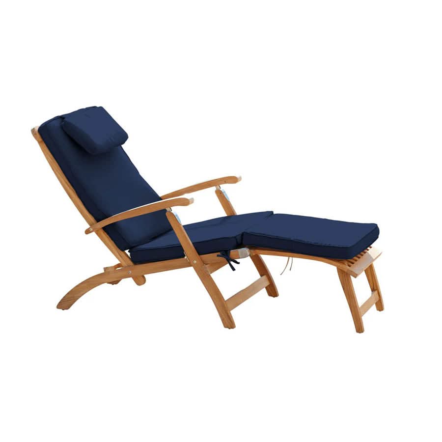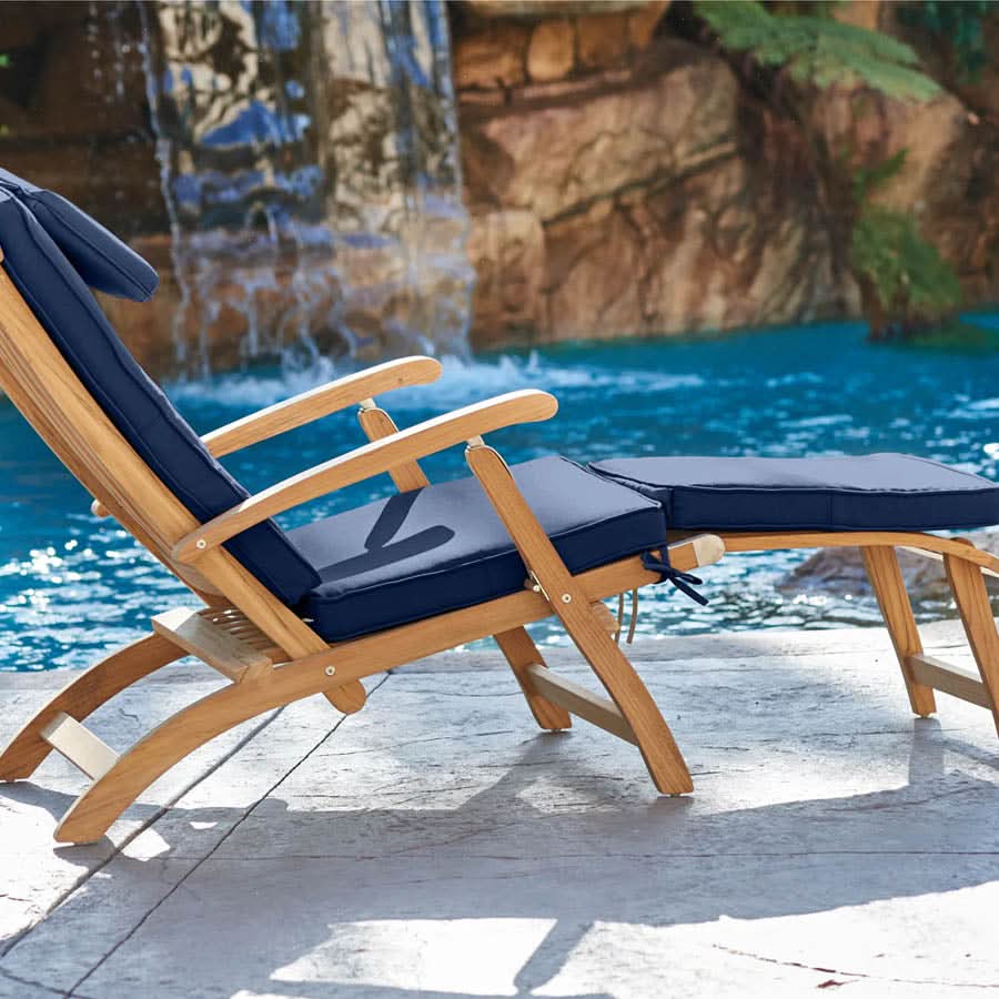 • The Anders Deck Chair is a steamer-style chaise lounger made from weather resistant teak and cushioned with performance fabric.