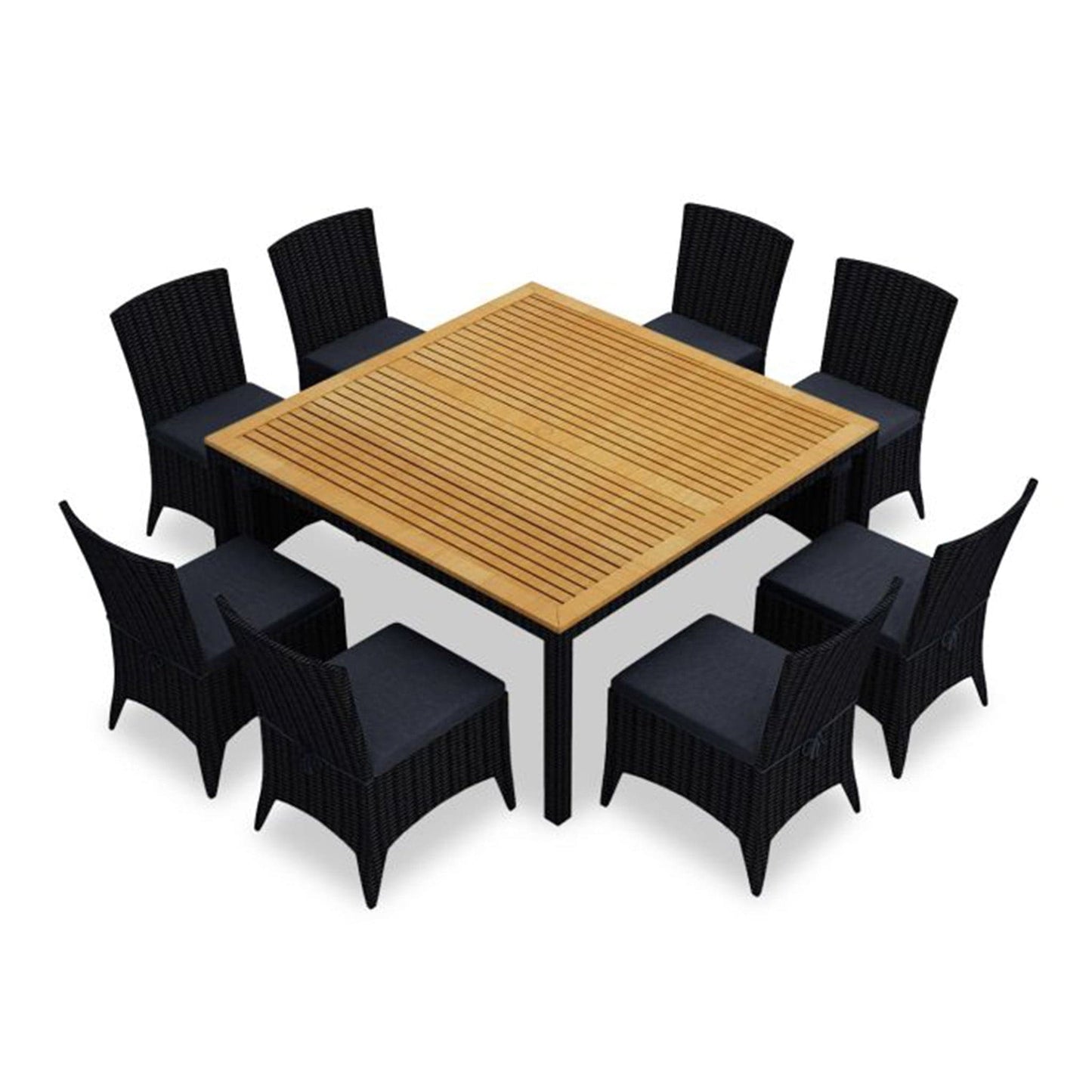 Dine in comfort and style with the Arbor 9 Piece Square Dining Set by Harmonia Living. This collection's gently flared edges, teak highlights and dark wicker finish give it a unique visual appeal, while sturdy, all-weather construction ensures lasting performance across the seasons. The wicker is made with durable High-Density Polyethylene (HDPE) and finished in a beautifully textured Coffee Bean color, which gives it a natural feel. Its Grade A teak table top has been kiln-dried, removing excess moisture to ensure it will not crack or warp. This set's sturdy aluminum frames, double reinforced seats and fade resistant cushions are made to endure in any outdoor setting, rain or shine. If you wish to order this set through Harmonia Living's Quick Ship program, make sure to select a Quick Ship (QS) fabric before checkout! All cushions are made in the USA from Sunbrella, Outdura, and Revolution performance fabrics which carry a 5 year fade warranty. This set comes with 8 Dining Side Chairs and 1 Square 8-Seater Table, perfect for your patio or outdoor lounge.