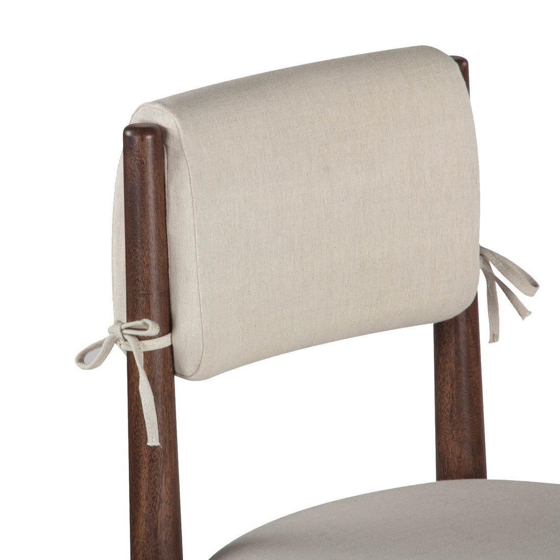• Featuring gently reverse tapering cylindrical legs, the dark of the wood complements the light colored premium linen fabric.
