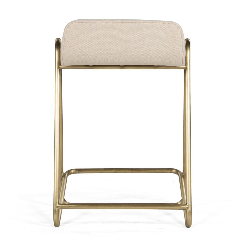 Inspired by the bends of a paper clip, the Clipper stool features a dynamic steel tube leg frame, finished in a warm, antique brass. A plush seat upholstered in a natural, cotton Dhurrie fabric provides a comfortable seat in any entertaining or dining space.