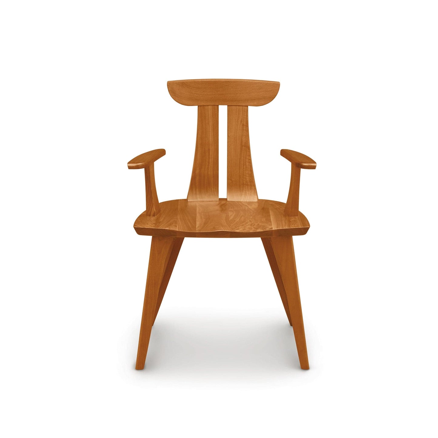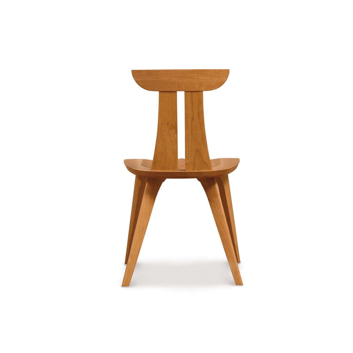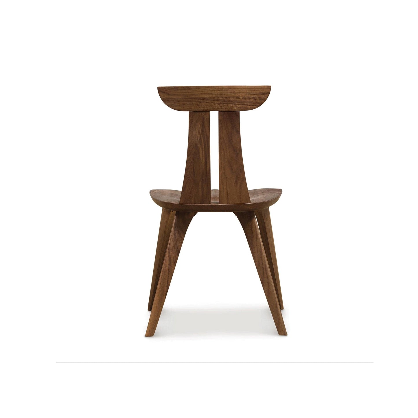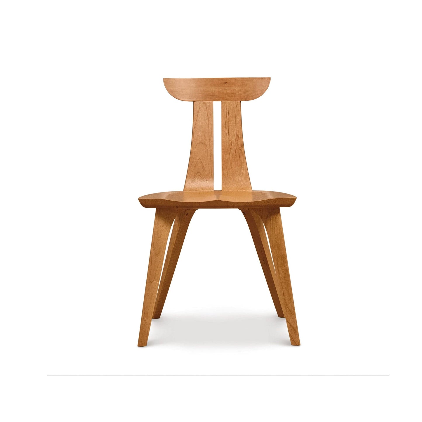 The Copeland Estelle Dining Chair is a stylish and sophisticated piece of furniture that is sure to elevate the look of any dining room. Made from solid cherry or walnut hardwood, this chair is not only beautiful but also built to last. The chair features a sleek, modern design with clean lines and a comfortable, contoured seat. The backrest has a slight curve to it, providing added support and comfort for those seated in it. The chair is finished with a low-sheen GREENGUARD top-coat for added durability and protection. The Copeland Estelle Dining Chair is a perfect choice for those who want to add a touch of elegance and style to their dining room.