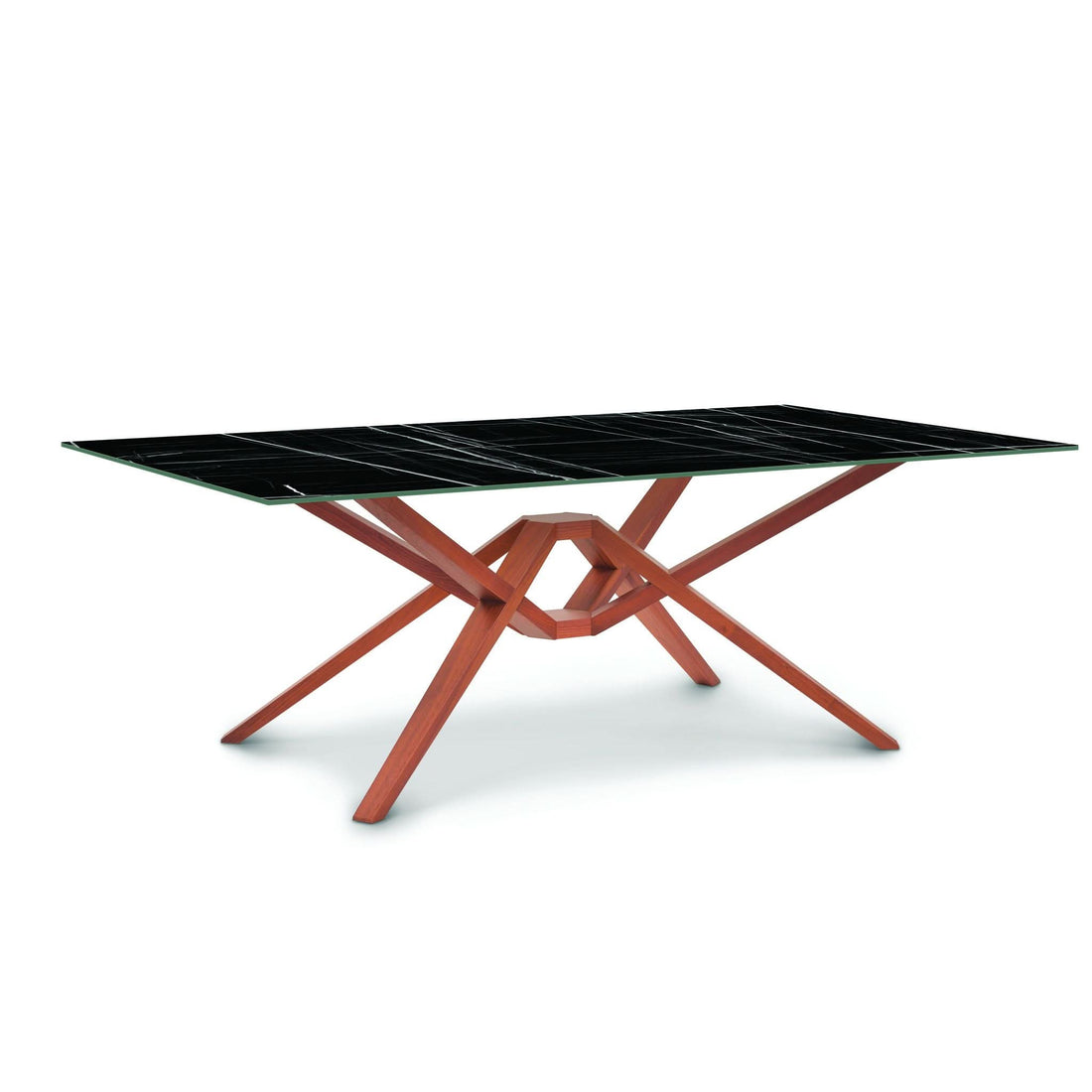 The Copeland Exeter Sintered Stone Top Table is a beautiful piece of furniture that is perfect for any dining room. This table is handcrafted in Vermont using sustainably harvested solid American hardwoods and imported Sintered Stone, ensuring that it is both durable and eco-friendly. The table is available in two sizes and a variety of finishes, making it easy to find the perfect fit for your space and style. The table's clean lines and simple design make it versatile enough to complement a variety of different decor styles, from modern to traditional. The stone top is sturdy and durable, making it perfect for families or anyone who loves to entertain.
