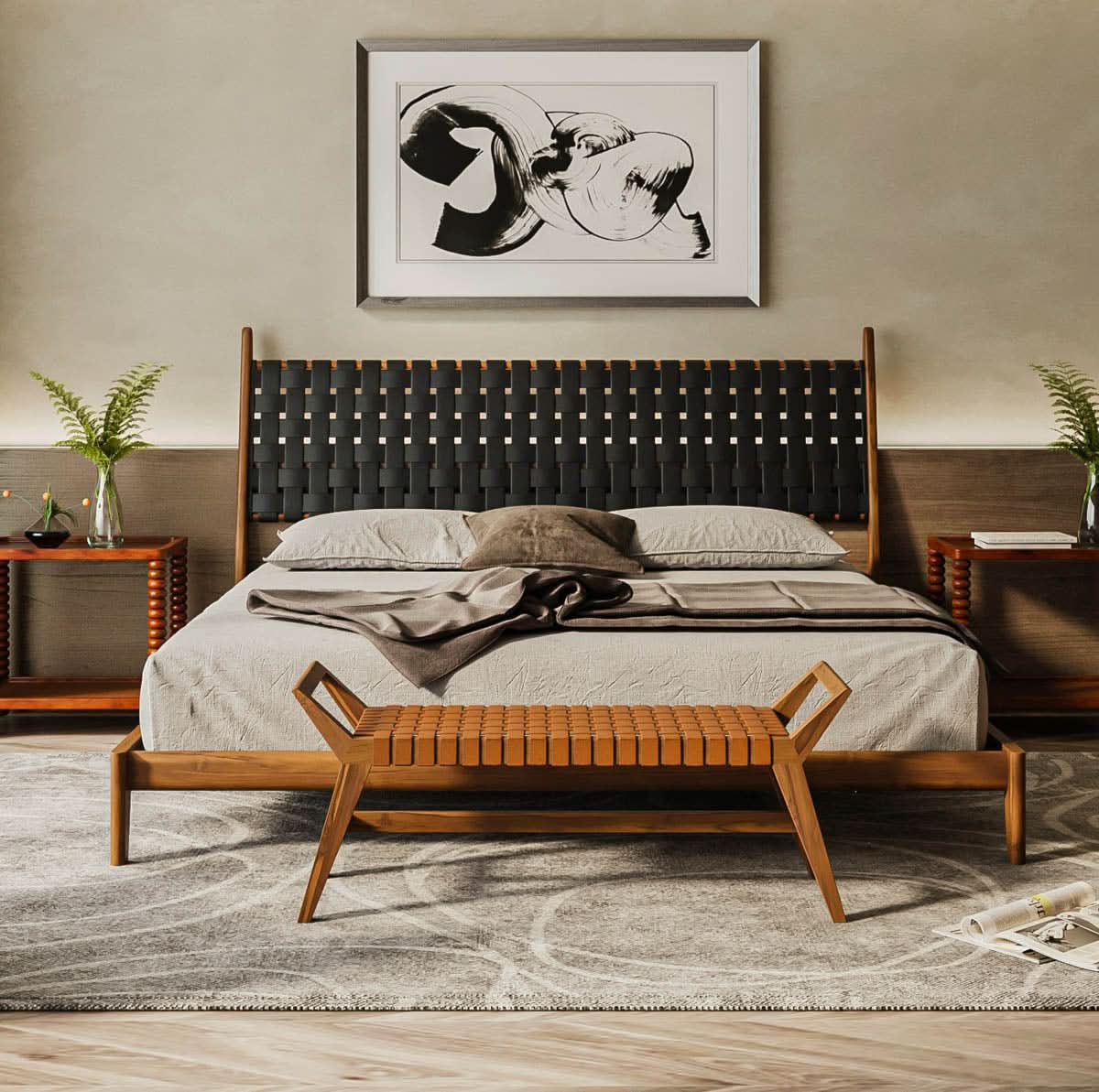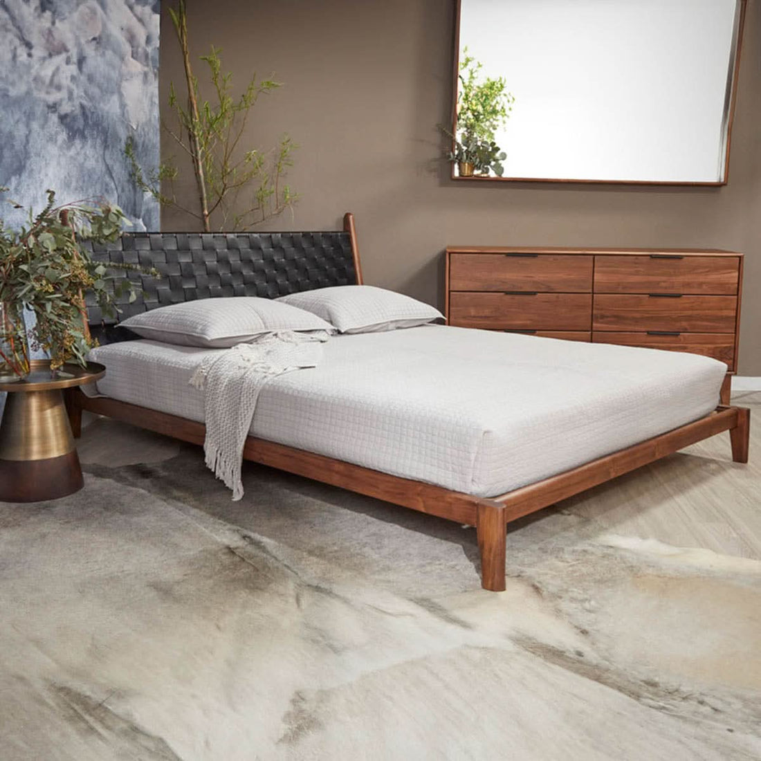 • The Cove Platform Bed from Union Home is a bed constructed with teak and a woven leather headboard.