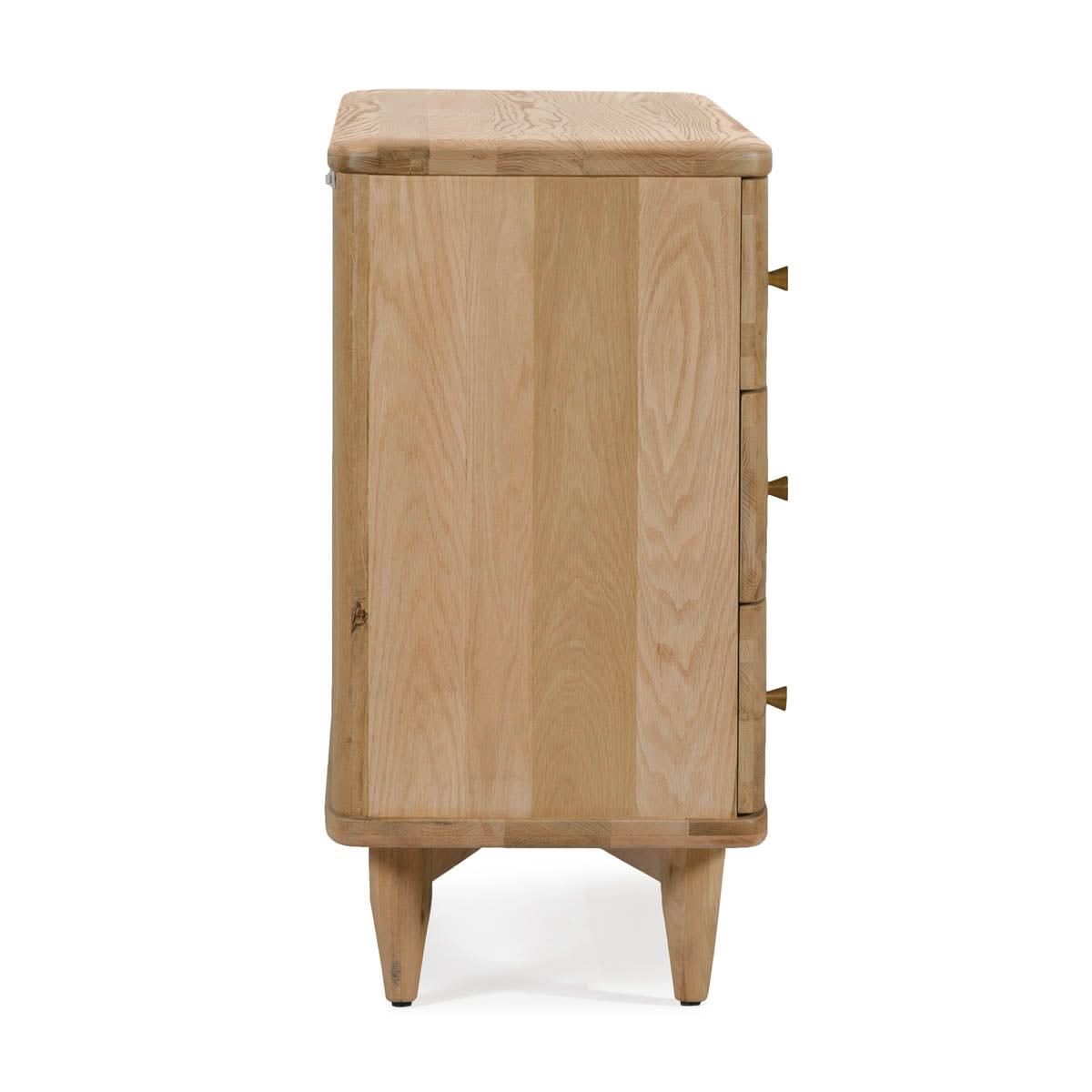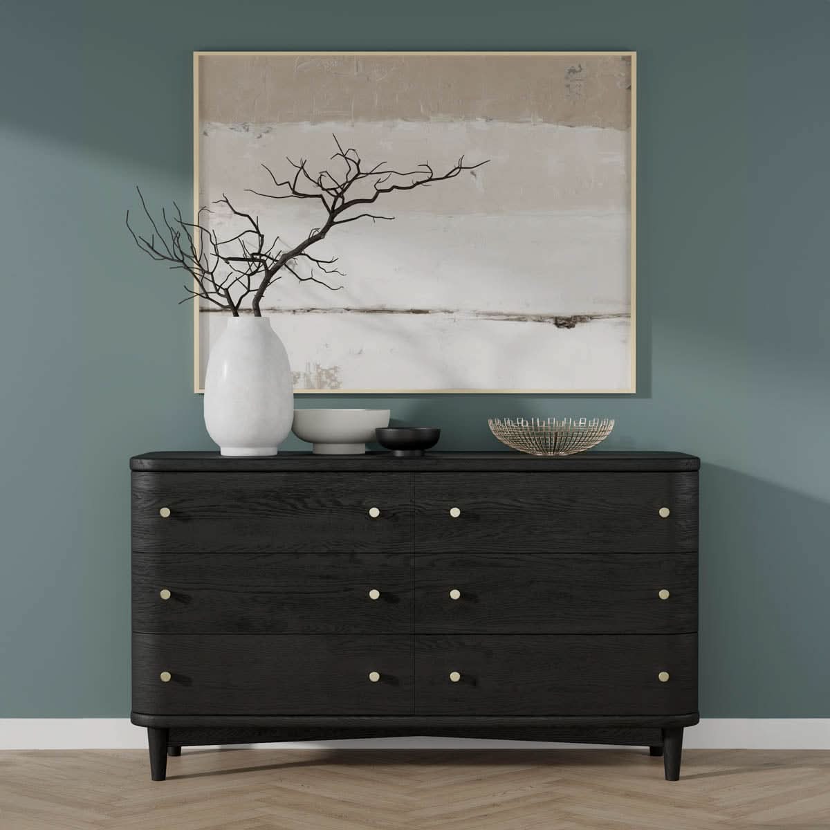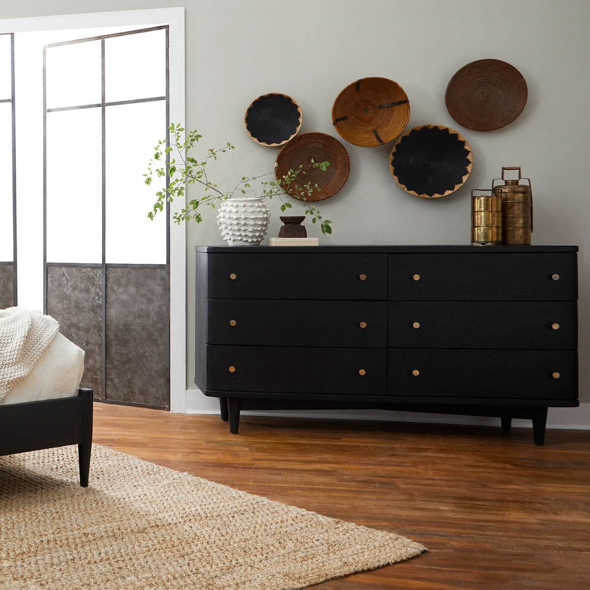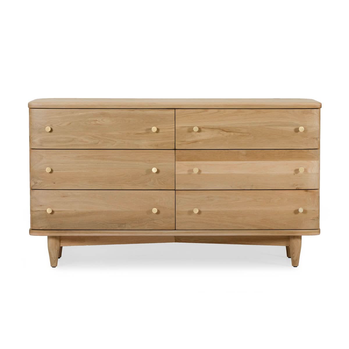 The Daniel Dresser is a six-drawer double dresser crafted from solid oak from Union Home. The Daniel Dresser is a dramatic addition to any bedroom space. Crafted from FSC Certified Oak Wood, the dresser features a sculptured profile with soft edges. The textured surface is sealed with a water based finish to highlight the natural beauty of the grain. 6 generously sized drawers open smoothly to reveal ample space for storage.