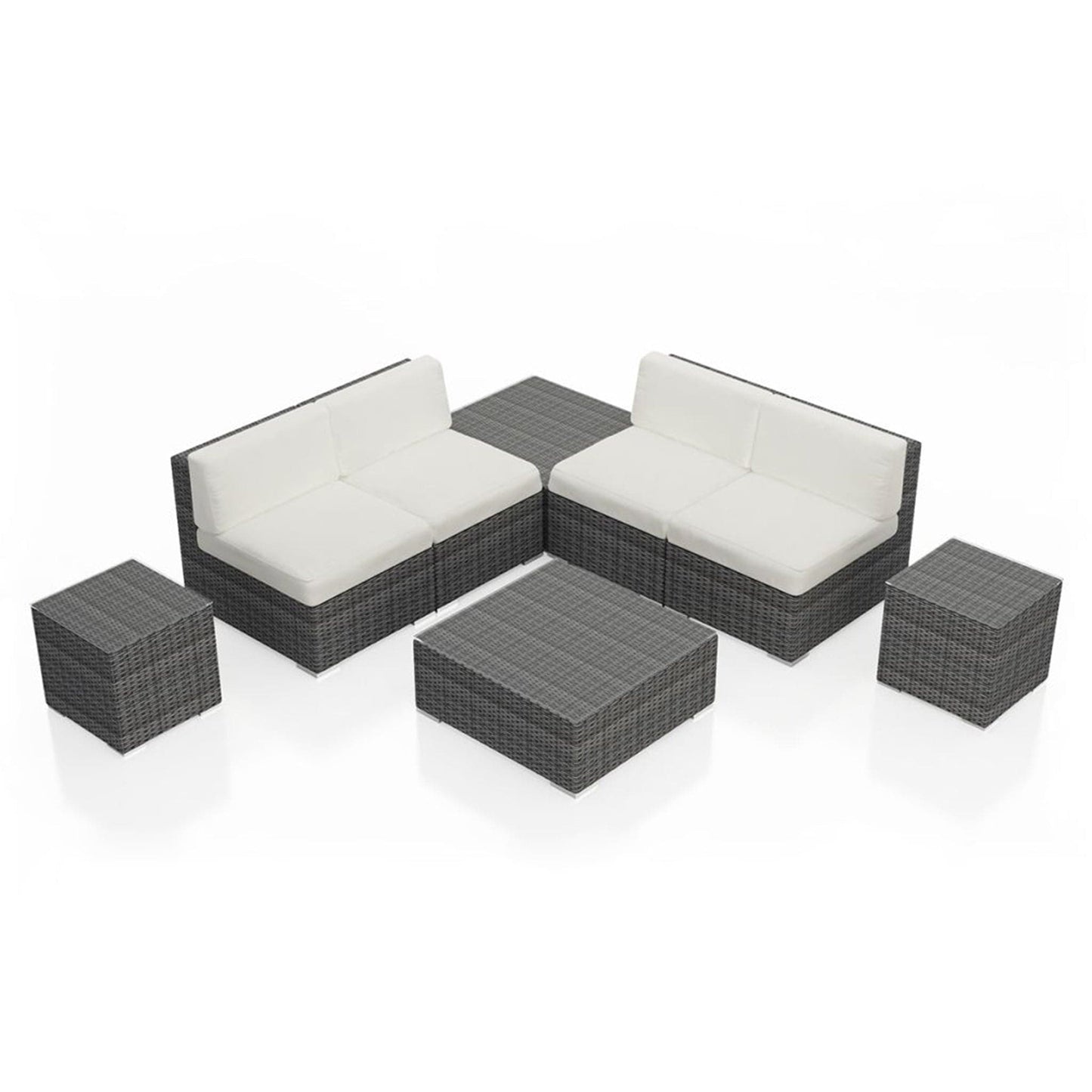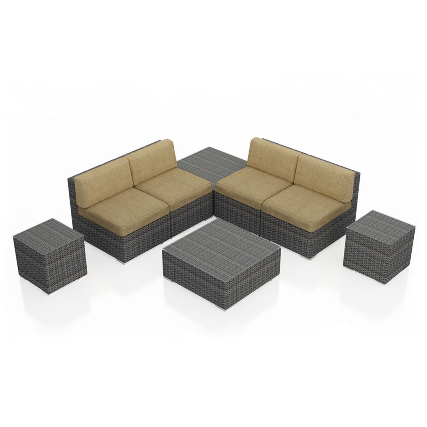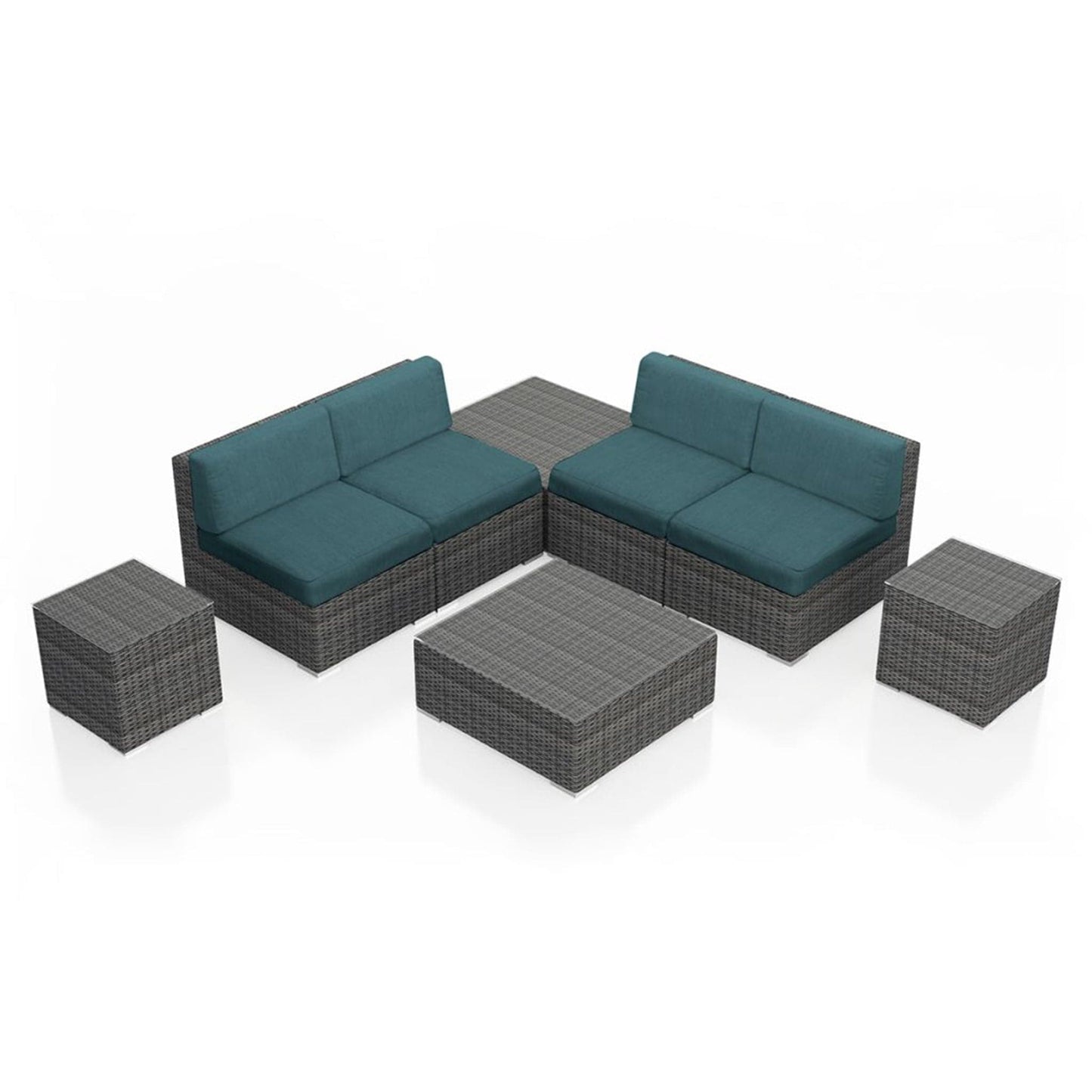The District 8 Piece 4-Seat Sectional Set by Harmonia Living is designed to provide plenty of seating room and ensure your total comfort as you unwind outdoors. This collection's clean lines, flat, woven design and weathered look give it a unique visual appeal, while sturdy, all-weather construction ensures lasting performance across the seasons. The wicker is made with durable High-Density Polyethylene (HDPE) and finished in a beautiful Textured Slate color, which gives it a natural feel. Its sturdy aluminum frames, triple reinforced seats and fade resistant cushions are made to endure in any outdoor setting, rain or shine. The tables are topped with extra strong tempered glass, a finishing touch that is ideal for frequent use. If you wish to order this set through Harmonia Living's Quick Ship program, make sure to select a Quick Ship (QS) fabric before checkout! All cushions are made in the USA from Sunbrella, Outdura, and Revolution performance fabrics which carry a 5 year fade warranty. This set comes with 4 Middle Sections, 2 Square Coffee Tables, 2 Glass Top and 2 Square End Tables, perfect for your patio or outdoor lounge.