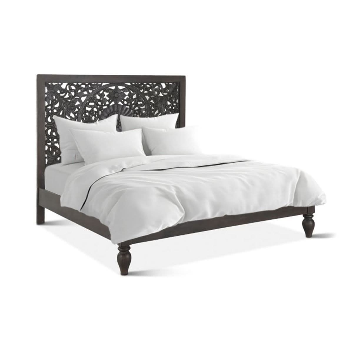 • Headboard features floral and leaf detailing hand-carved by experienced artisans into the wood