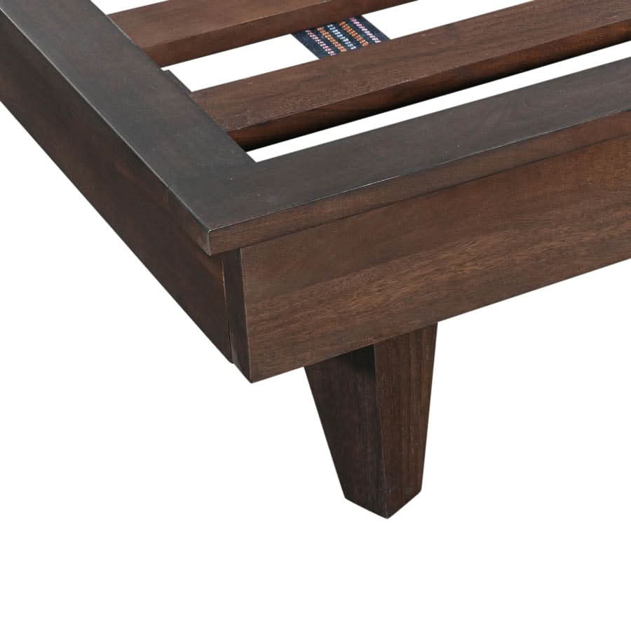 The Lisbon Platform Bed is a solid mango wood platform bed with a beautifully carved headboard from Home Trends & Design. The mid-century modern design of the furniture in the Lisbon collection features simple clean lines and an open airy feel, lending to the contemporary modern look. This stylish platform bed features a royal brown finish that complements its sleek design. Hand carved and constructed from solid mango wood, this bed is available in standard king and queen sizes.