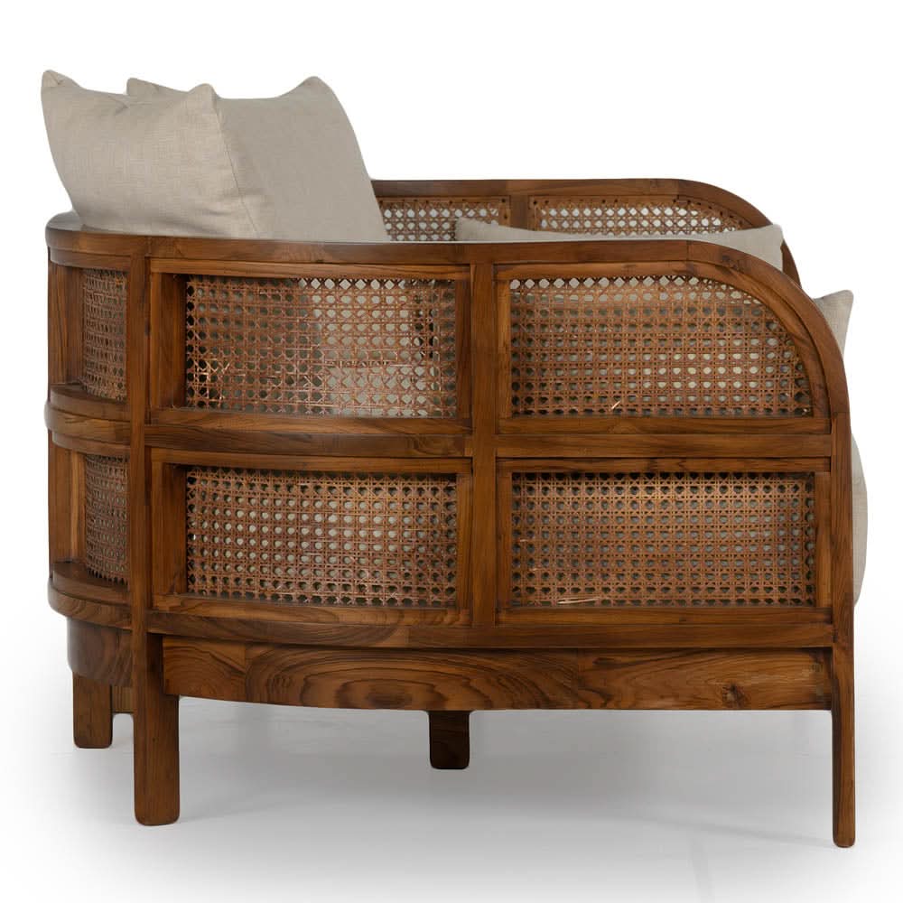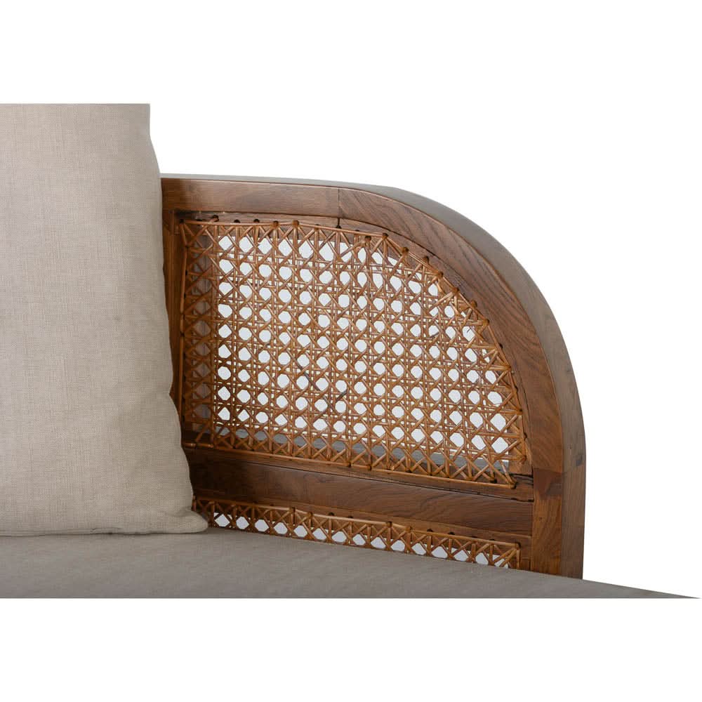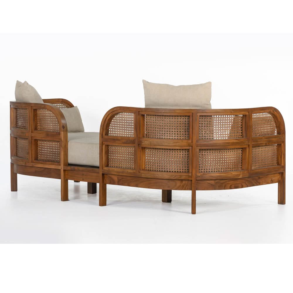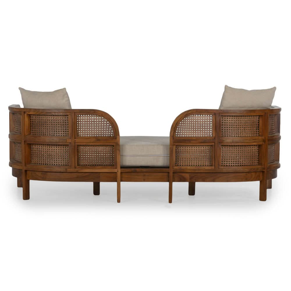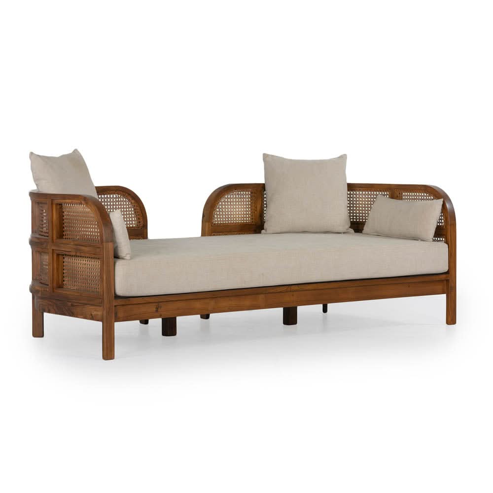 • The Nest Daybed is constructed from recycled Teak in a rich Porto finish, with premium natural cane panels and an upholstered natural linen mattress/cushion.