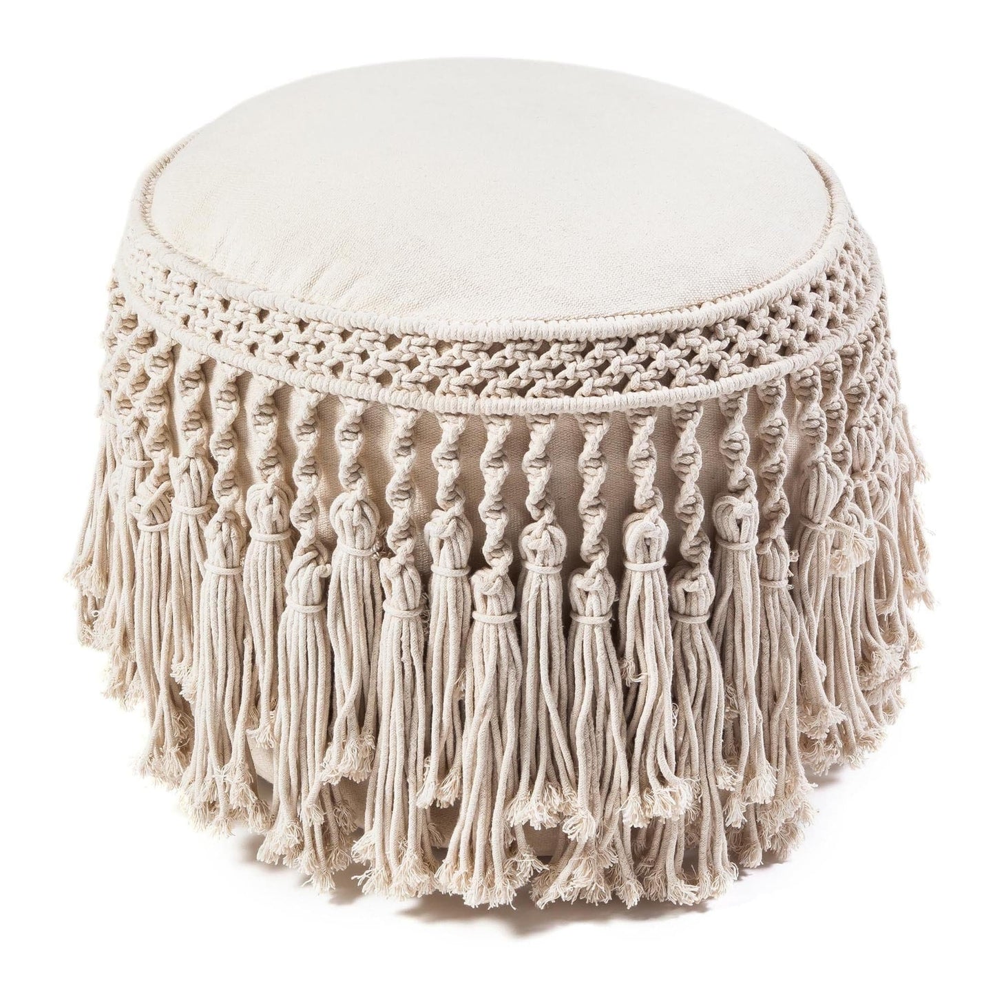 - The handmade Pretty Bird Pouf is adorned with playful tassels all around.